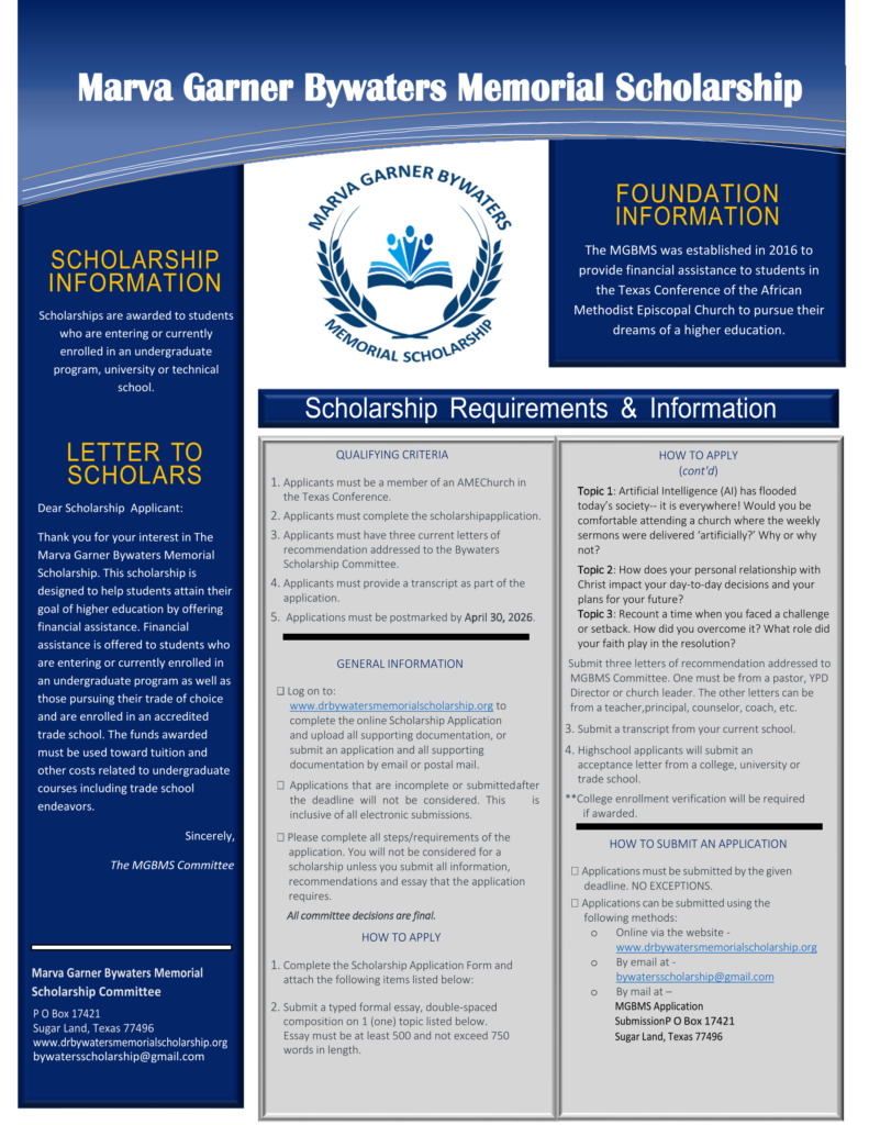 Apply Now🡺 2026 “Marva Garner Bywaters Memorial Scholarship Application 🡸 The 2026 MGBMS Applications are now open!! Please click the link above to apply.